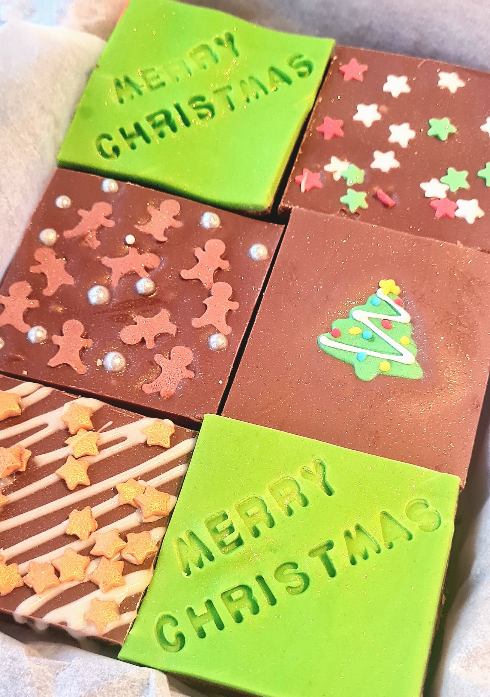 A soft biscuity chocolately base topped with creamy milk chocolateβ¦and decorated with Christmas Sugar Icing decorations and Christmas sprinkles.