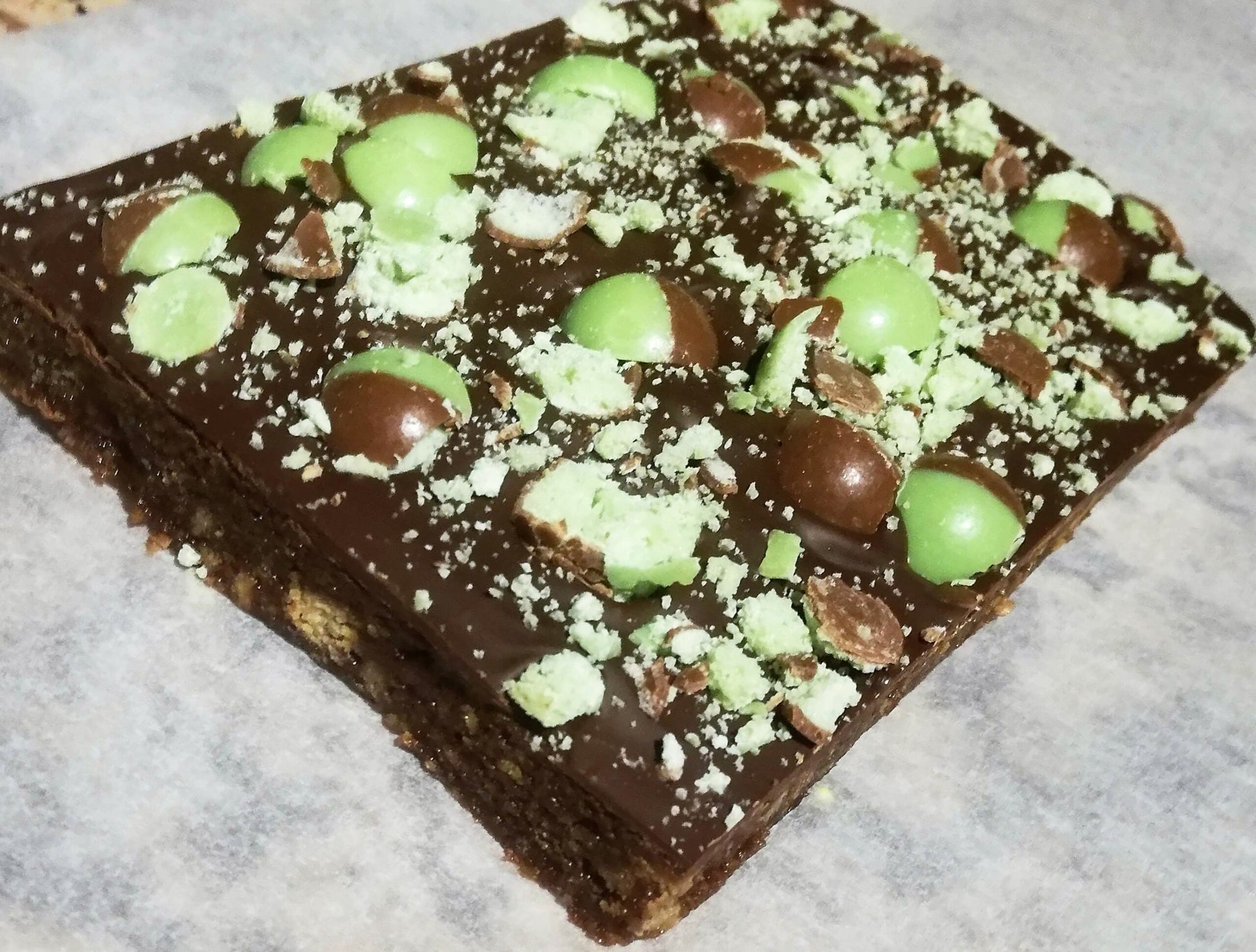 Our soft chocolatey biscuity base topped with a generous layer of creamy dark mint chocolate and finished lots of lovely Aero pieces!